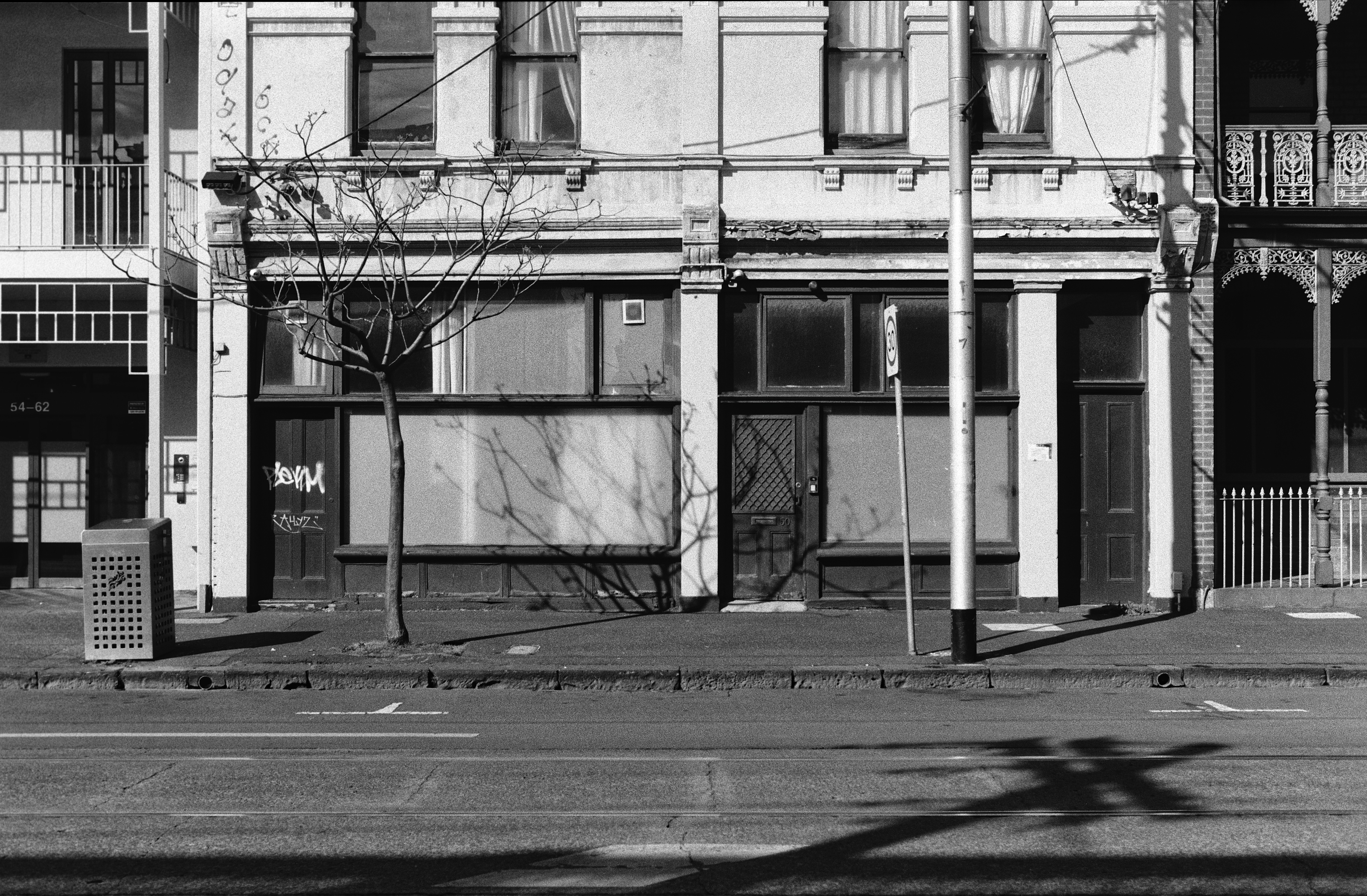 The shot of the building below is directly across the street. Comparing the two photographs, the only thing they have in common is the style of composition. The shot below has more depth, with the street being on the near-plane, then the footpath, and then the sign and door shelter. The shot from 2023 is simpler. At first glance it’s completely flat, and then the eye discovers the door shelter, and subtleties of the footpath and detail around the building. Lighting, contrast, and revealed detail in the picture (done by natural lighting, not post-processing) are miles apart. I felt the conditions weren’t bad on the 2025 day, but evidently not as good as 2023. I had a polariser on the lens, though still may have overexposed the walls meaning the layers of paint covering graffiti aren’t visible.