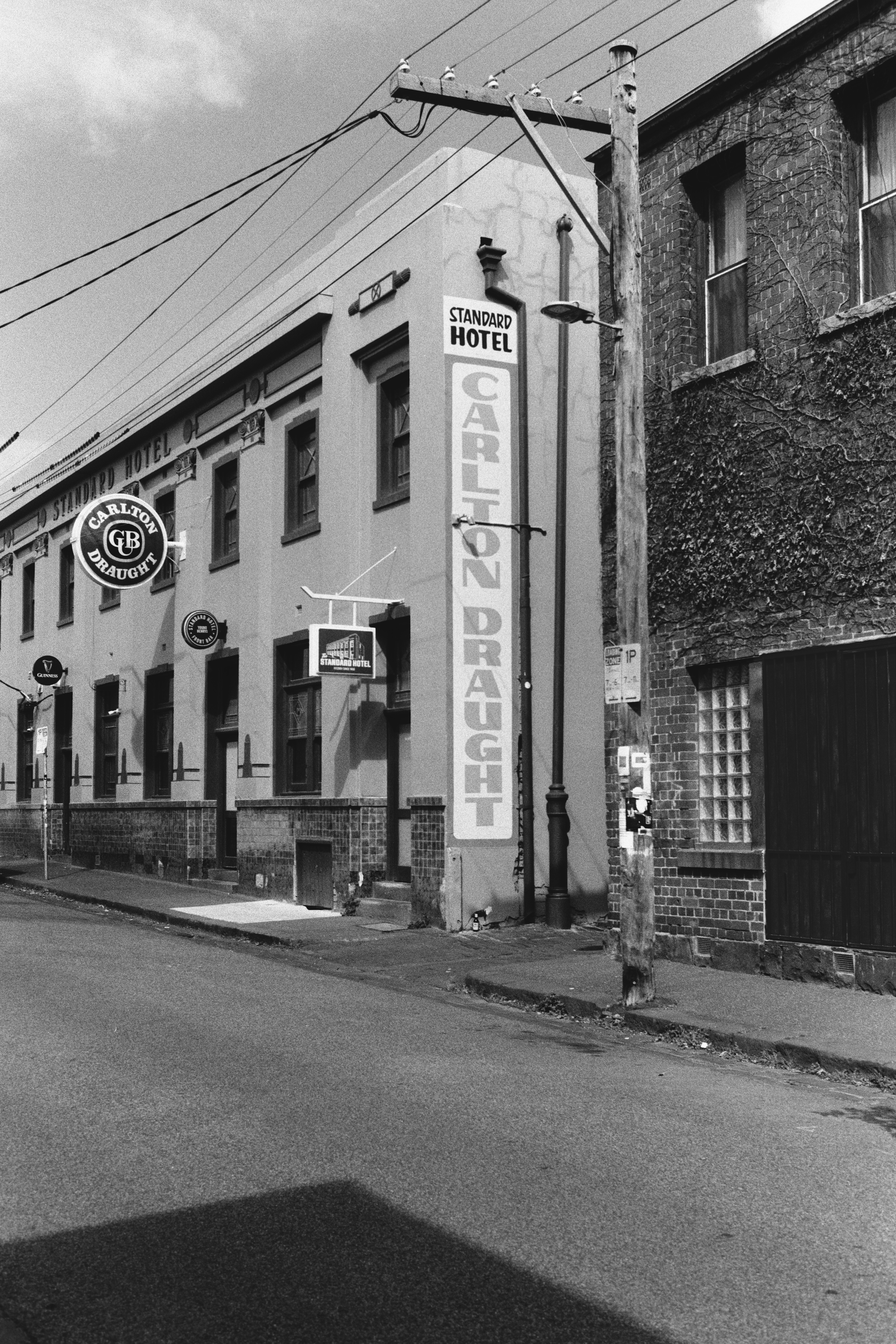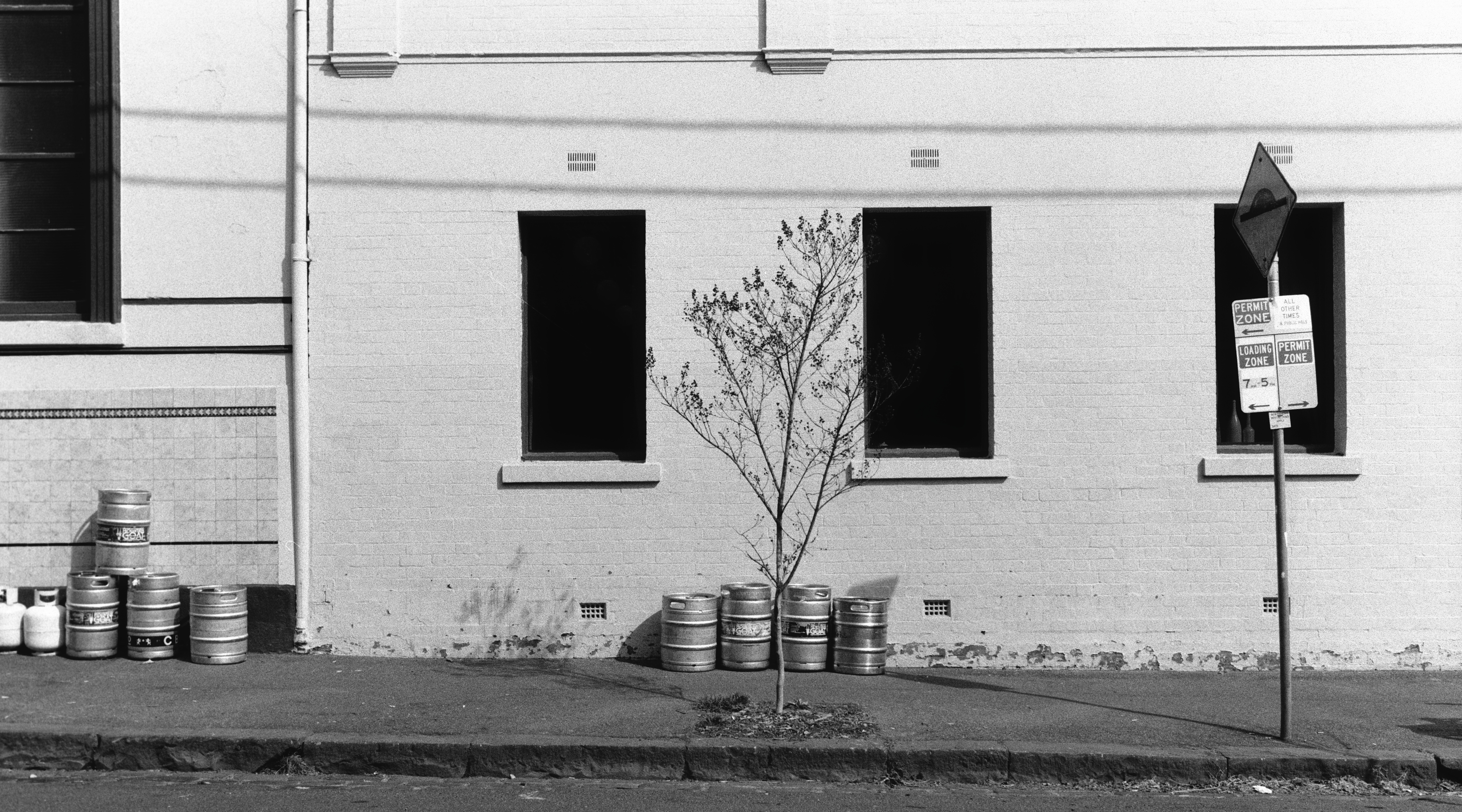 The shot of the building below is directly across the street. Comparing the two photographs, the only thing they have in common is the style of composition. The shot below has more depth, with the street being on the near-plane, then the footpath, and then the sign and door shelter. The shot from 2023 is simpler. At first glance it’s completely flat, and then the eye discovers the door shelter, and subtleties of the footpath and detail around the building. Lighting, contrast, and revealed detail in the picture (done by natural lighting, not post-processing) are miles apart. I felt the conditions weren’t bad on the 2025 day, but evidently not as good as 2023. I had a polariser on the lens, though still may have overexposed the walls meaning the layers of paint covering graffiti aren’t visible.